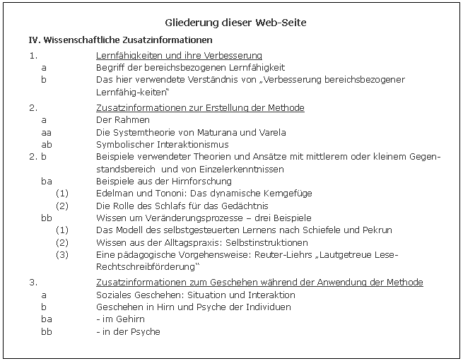 - Theorien und Ansätze mit mittlerem oder kleinem Gegenstandsbereich und Einzelerkenntnisse, die in den Rahmen gesetzt werden. Sie kommen hauptsächlich aus Neurowissenschaft, Psychologie und Pädagogik. Einzelne Beispiele werden angerissen - etwa Edelmans und Tononis gut belegte Hypothesen zum „dynamischen Kerngefüge“ (→) oder Reuter-Liehrs „Lautgetreue Lese-Rechtschreibförderung.“ (→)